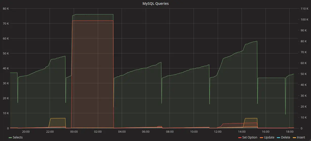 Below you can see our MySQL Queries counter which clearly shows our 3-hour restart hack. Where it flatlines is where the service was down.